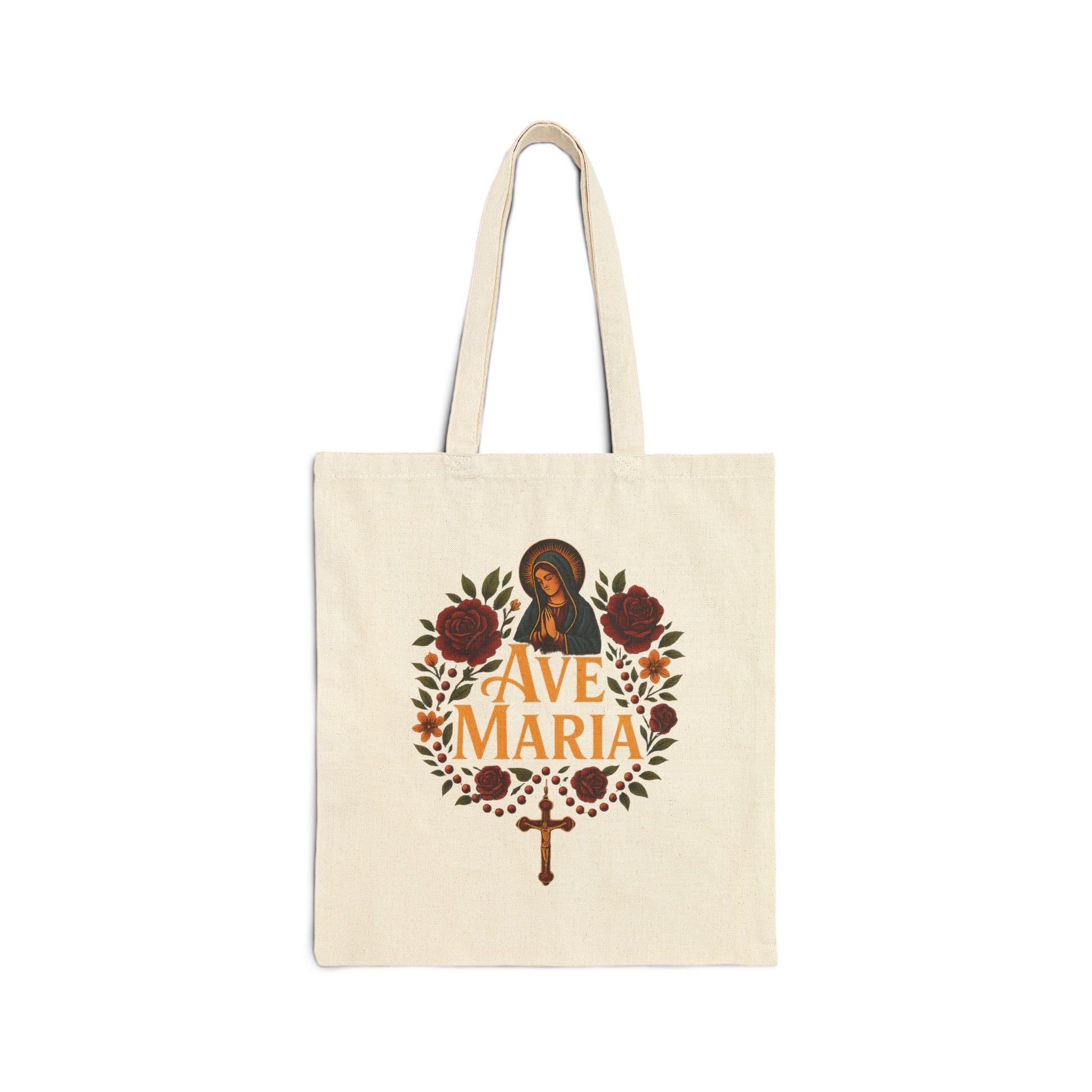 Ave Maria Cotton Canvas Tote Bag, Eco-Friendly Shopping Bag, Religious Gift, Floral Design, Perfect for Everyday Use